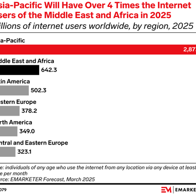 eMarketer 研究认为,2025 年亚太地区的互联网用户可达 28.734 亿户,远超其他地区。