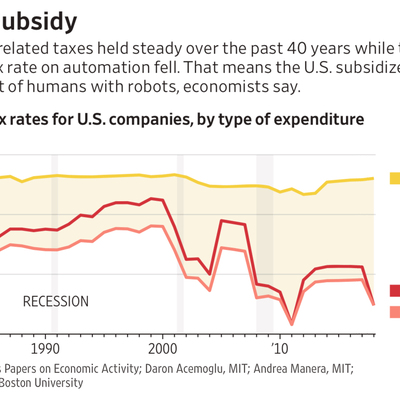 文章认为,美国近四十年来,围绕工人薪酬相关的税收比例一直比较稳定(见图一);而软件、自动化设备方面的税率则持续降低。