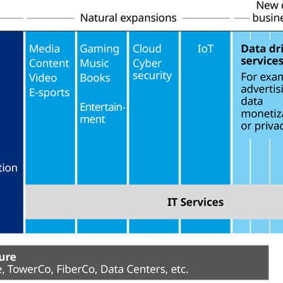 Oliver Wyman 咨询公司给出了一个简要模型,展示了传统运营商进入转型期后的产品体系结构。
