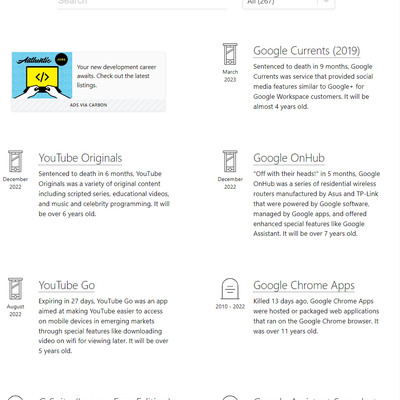 看到一个有趣的网站( https://killedbygoogle.com/ ),爱好者列举了 Google 关闭过的业务列表。其收录了 267 项已经关闭的 Google 产品,其中硬件类 21 项,App 类 51 项,服务类 195 项。