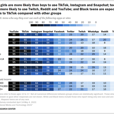 Pew Research Center 对美国不同肤色、教育背景和性别的青少年在应用选择上的调研,可以看到几个有趣的点: