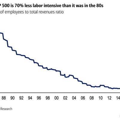 标普 500(S&P 500)是在美国上市的 500 家最具代表性的大型企业。1986 年这些企业每创造 100 万美元收入,平均需要 8 位员工。现在这个数字降到只需要 2 位员工多一点。