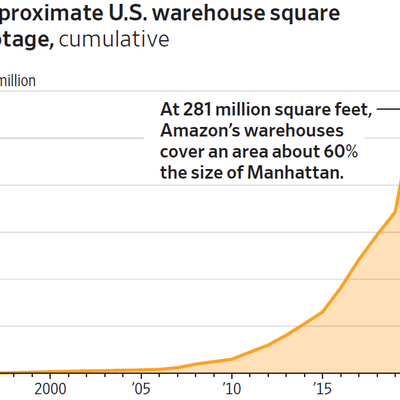 当前 Amazon 的仓储面积到了 2.81 亿平方英尺,接近曼哈顿 60% 的面积大小。