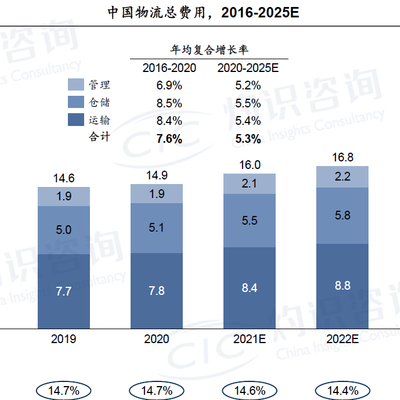 根据灼识咨询的研究,预计到 2025 年中国物流行业总费用可达 19.3 万亿,2020-25 复合增长率 5.3%。