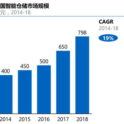 中国智能仓储在医药和食品饮料等领域发展较多,2018 年市场规模达到 798 亿元,近年增幅 19%(九谦咨询)