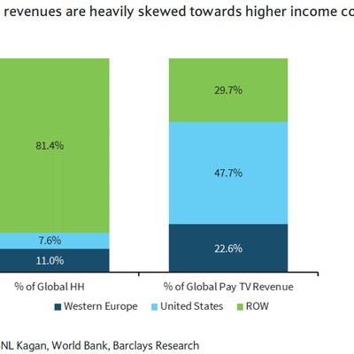 投资银行 Barclays 绘制了一张图,左侧是全球付费电视的用户构成,右侧是收入的构成。