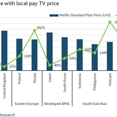 北美本地付费电视网很发达,Netflix 的定价只有 15~24%;西欧地区次之,Netflix 定价达到了付费电视的 50% 左右。