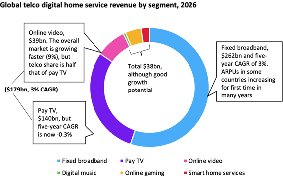 根据 OMDIA 咨询公司的研究,到 2026 年全球运营商的固定宽带业务收入将达到 2620 亿美元(CAGR +3%),付费电视 1400 亿美元(CAGR -0.3%),OTT 视频 390 亿美元(CAGR +9%),游戏 / 音乐 / 智能家居将达到 380 亿美元。