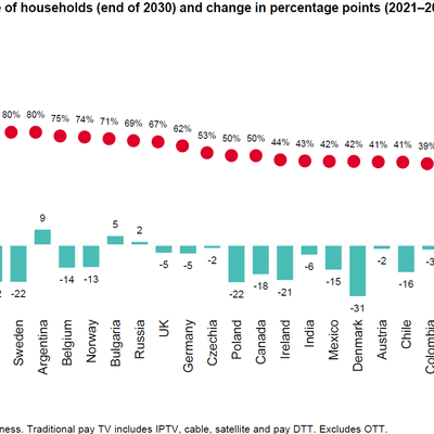 值得留意的点是:包含中国在内的相当一批国家,付费电视的家庭渗透率仍然保持在 90% 以上。