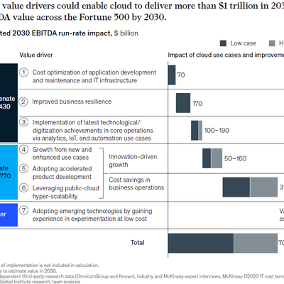 Mckinsey 的一项研究认为,财富 500 强企业,通过使用云计算,可在 2030 年创造 7,000 亿 ~1.2 万亿美元的 EBITDA。