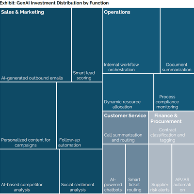 MIT 针对企业客户的调研,关于 Gen AI 的投资预算分配。销售与营销获得了 50% 的预算,中后台运营类获得 25% 左右,客户服务也获得了 25% 左右。