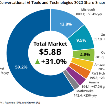 IDC 咨询公司研究显示,2023 年全球会话式 AI IT 工具收入体量为 53 亿美元。Microsoft、Google 和 Qualtrics 是排名前三的厂商。