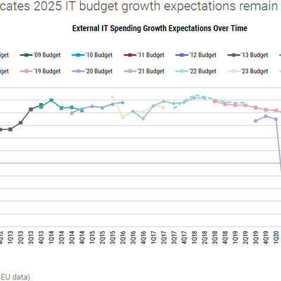 Morgan Stanley 针对美国和欧洲企业延续多年的 CIO 调研中,2025Q1 结果显示 2025 年的 IT 支出同比去年会增长 3.7%(图 1 列出了 2008Q3 至今的全部调研结果)。