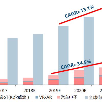 中信证券预测 2021 年广域 IoT(含蜂窝)、VR/AR、汽车电子等对于传感器的需求规模约72.5、11.4、67.8 亿美金,三者合计规模占全球传感器总规模届时将提升到 22.9%。