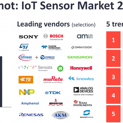 五项关键的趋势性技术为:① 智能传感器,② 节能传感器,③ 虚拟传感器;④ Sensor fusion 传感器融合(将不同传感器的信号进行融合,从而得到最佳的探测结果),⑤ 生物传感器(对酶、抗体、抗原、微生物、细胞、组织、核酸等生物活性物质进行检测)。