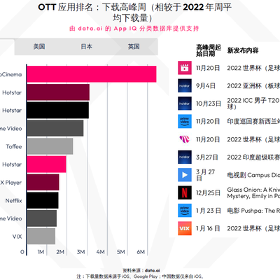 附图来自 data.ai,其归纳了 2022 年全球 OTT 视频应用周平均下载量。