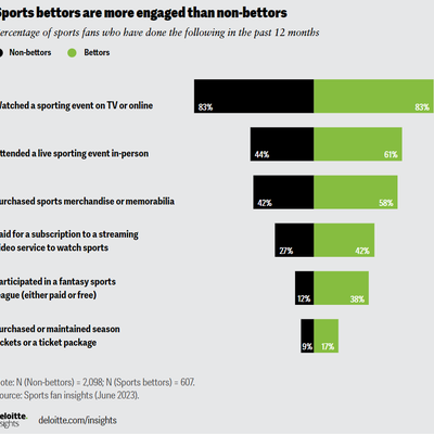德勤的调研显示,虽然很多用户会通过电视或 OTT 线上视频观看体育赛事,但体育博彩参与者与非博彩者的投入程度会有很大的差别。