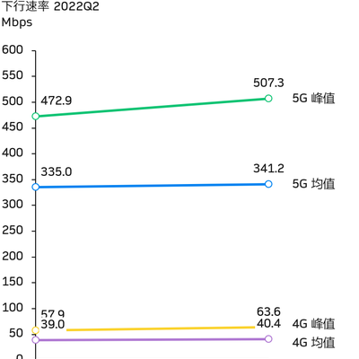 5G 下行和上行的均值速率分别为 341.20 Mbps 和 71.98 Mbps。4G 下行和上行的均值速率分别为 40.43 Mbps 和 23.11 Mbps。