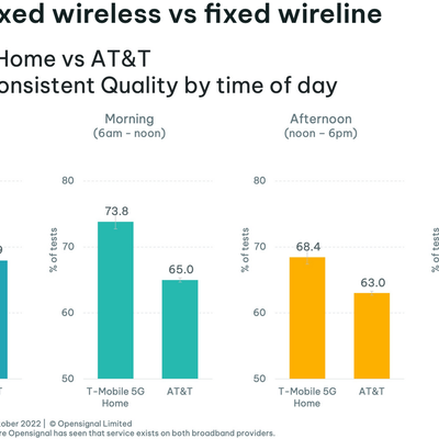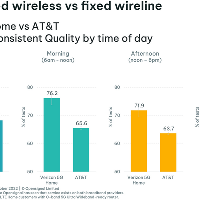 第三方网络测评机构 Open Signal 的数据显示,Verizon 5G Home(基于 5G FWA 固定无线接入)的宽带一致性质量超过了 AT&T 的固定宽带。
