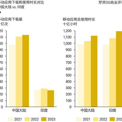 中国和印度人口差不多,而且近年来印度的移动通信发展迅猛,智能手机渗透率和 5G 用户流量也起来了。两个市场的移动应用总时长很接近。