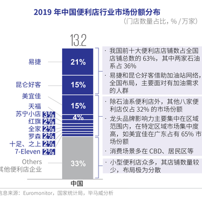 对比而言,中国的市场集中度还有很大的提升空间:两家石油系(易捷、昆仑好客)占据了 36% 份额,第三名美宜佳重点聚焦在广东,其他品牌则份额普遍小。