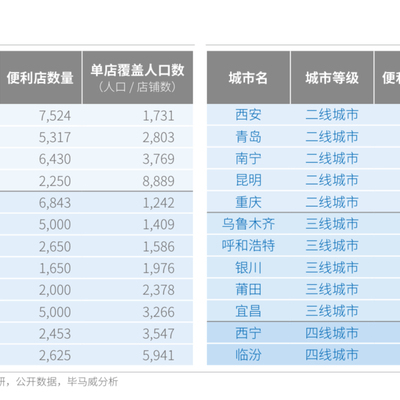 一线城市中,北京便利店密度最低;二线城市中重庆、昆明、南宁、青岛的单店覆盖人数远高于同等经济水平城市。
