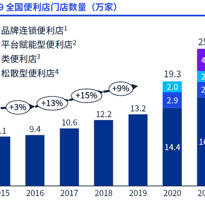 根据 KPMG 的研究,2021 年全国一共有各类便利店 25.3 万家,其中品牌连锁便利店有 16.3 万家,数量最大,增速约13%。