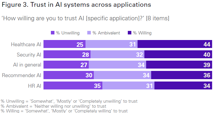 在 AI 的应用类别中,AI 用于医疗的民众信任度是最高的,AI 用于人力资源的信任度则最低。