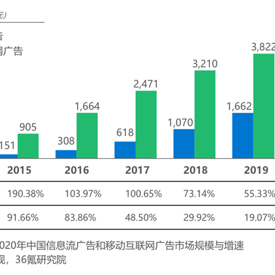 36Kr 基于易观的数据,对比了中国移动互联网广告与信息流广告的收入规模。
