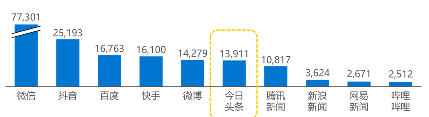 (1) 今日头条 App 在 DAU(日均活跃用户)排名第六,(2) 在人均使用次数排名第三,(3) 在人均使用时长排名第一。