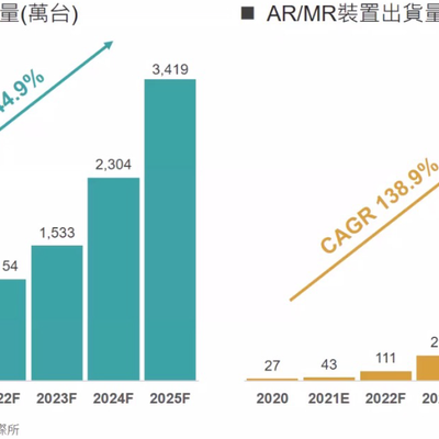 预测 2025 年,VR 头显可达 3,419 万部,AR 为 2,101 万部。