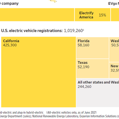 附图是 WSJ 绘制的美国电动汽车快速充电桩的一览。截止到当前,特斯拉的充电桩占据了全美 56% 的份额;Electrify America (15%)和 EVgo network (8%)位居二三名。