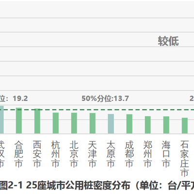 来自中国城市规划设计研究院的研究,中国 25 个主要城市公用桩的平均密度为 17.3 台/平方公里。深圳、上海、广州、南京、长沙和厦门排名靠前,公用桩密度超过 20 台/平方公里,其中深圳市的公用桩密度最高,达到73.2 台/平方公里。