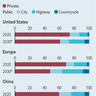 新能源汽车需要大量的充电桩提供电力服务。经济学人引用 BCG 的数据绘制了附图,展示了美国、欧洲和中国三大市场对充电桩地理位置的需求分布。