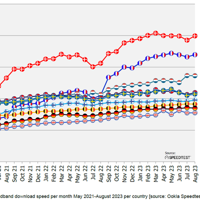 2023 年以后,丹麦的下行速率中位数保持在了 200Mbps,位列第一。