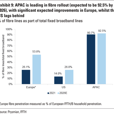 高盛预测到 2026 年,欧洲的固定宽带将有 53.8% 是光纤宽带,而美国则继续处于较低水平。