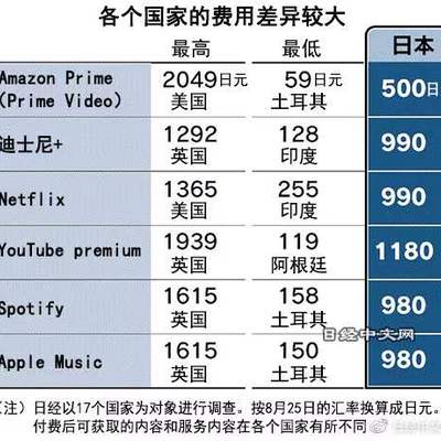 Nikkei 对比了国际市场六大流媒体服务商(Amazon Prime Video、Disney+、Neflix、YouTube Premium、Spotify、Apple Music)的价格。