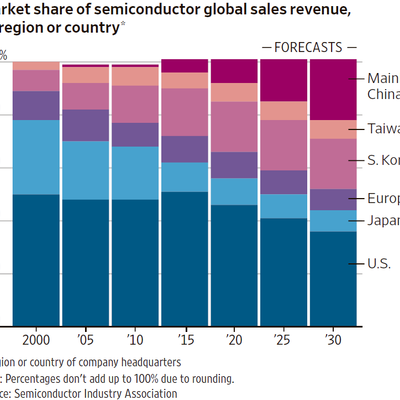 WSJ 基于全球半导体协会的最新数据,绘制了一张图展示了当前到 2030 年全球半导体产业的销售额的地域分布。