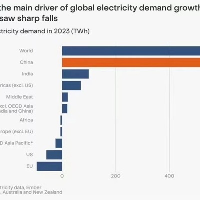 Ember 绘制了一张图,展示了 2023 年全球主要地区电力需求的增减变化。