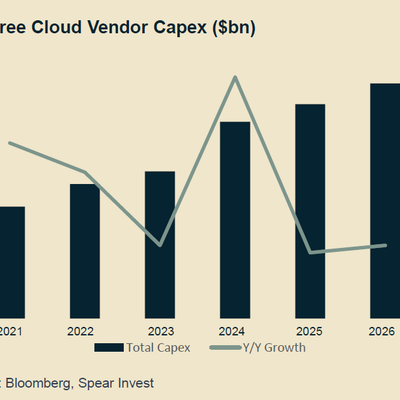 Spear Invest 预计公有云三巨头 AWS、Microsoft Azure 和 GCP (Google Cloud Platform) 在 2026 年的 CAPEX 投资将会超过 1,400 亿美元。