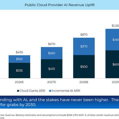 如果放眼未来,预计到 2030 年,全球公有云服务收入可达到 1.28 万亿美元,而 AI 相关的收入会大增到 5,500 亿美元。