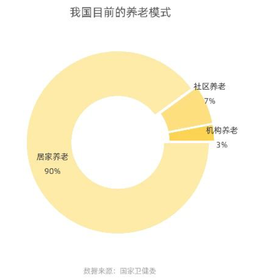 根据国家卫健委数据,中国养老呈 “9073” 格局,即 90% 左右的老人居家养老,7% 老人依托社区支持养老,3% 的老人入住机构养老。