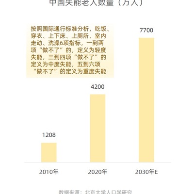 根据北京大学的研究,预计到 2030 年中国失能老人数量将达到 7700 万人。与此同时,调研显示中国有 96% 以上的失能老人以居家养老为主。