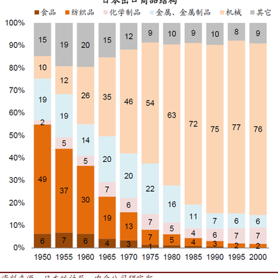 中金公司汇总了日本近五十年的出口商品类别变迁,可以看到一个清晰的产业升级过程。