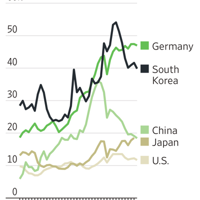 华尔街日报绘制了 1980 年至今,全球五大制造业大国的出口占 GDP 的占比。