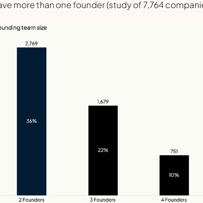 Carta 基于对其跟踪的 7,764 个创业公司的研究发现:创始人团队的人数最高比例是两人,占据了 36% 份额。