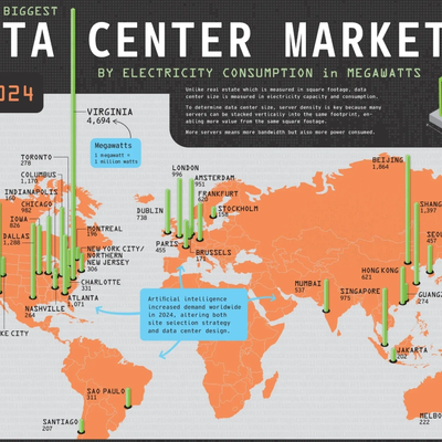 2024 年全球 Top 40 数据中心市场中,美国 Virginia(弗吉尼亚州)的数据中心达到了 4,694 Megawatts,是全球最高的数据中心。北京以 1,864 Megawatts 排名第二。