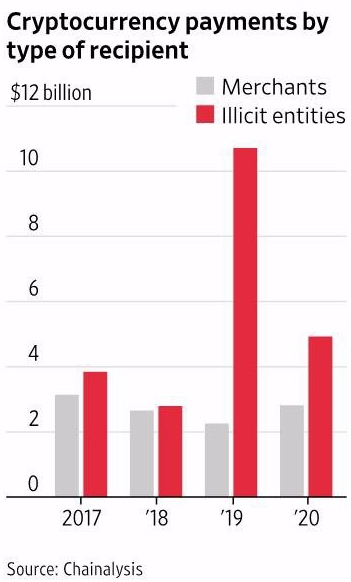 根据 Chainalysis 的研究,2017-2020 年用于商户交易的支付金额保持平稳状态,而用于 “非法实体” 交易的金额取得了大幅增长。