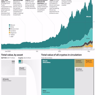 华尔街日报绘制了一张图,展示了加密货币 Top 7 这一年(2020.5 ~ 2021.5)的总市值变化。
