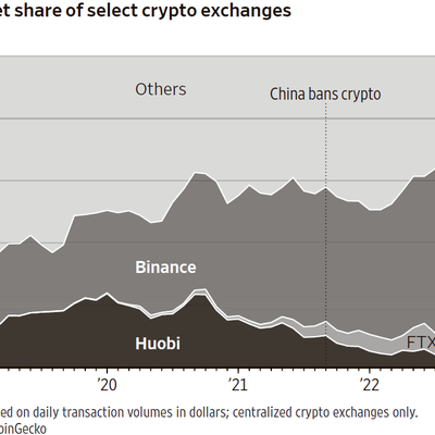 WSJ 绘制了一张图,展示了加密货币交易所的市场份额变化。2021年及以前,火币(Huobi)和币安(Binance)双雄并列。